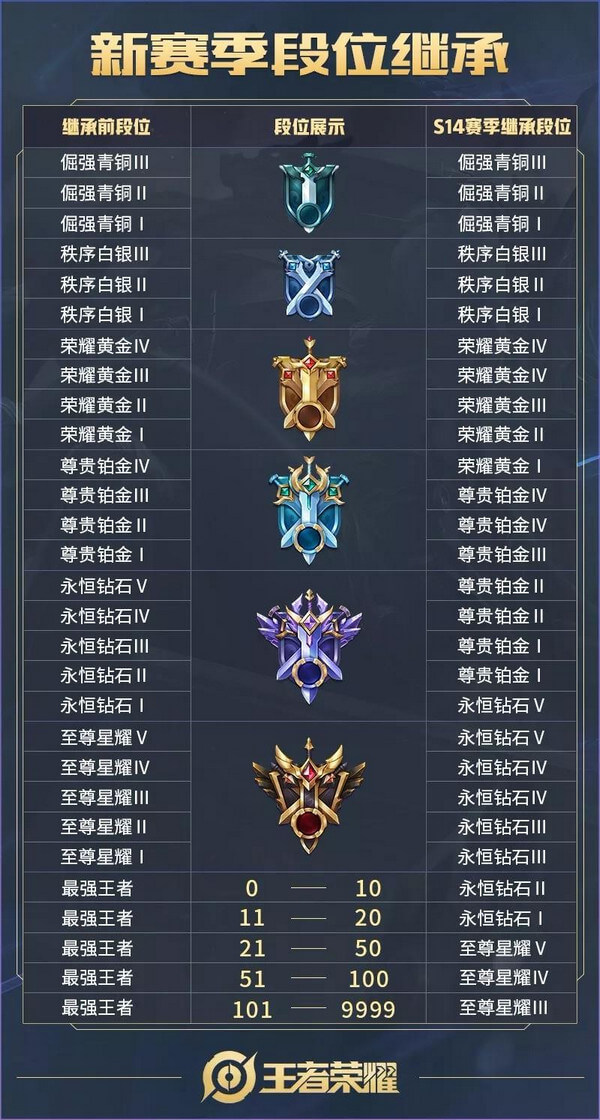 需要注意的是,由于s20新赛季段位继承表还没最终确定,大家可以参考S19赛季段位继承表,目前王者荣耀段位已经非常成熟,基本上不会有太大的变化,最多只是海报图可能会发送一些小调整,以上继承表仅作为参考。